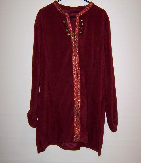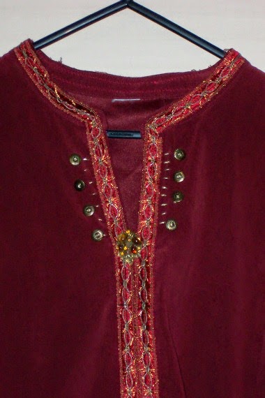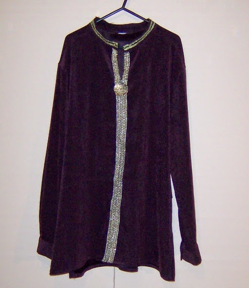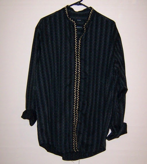 Next I moved on to adjusting clothing. These shirts were donated or found at op shops and were in my program’s wardrobe. I cut off the buttons and collar, stitched the front closed, added fancy braiding and voila: tunic.