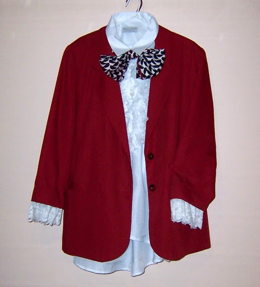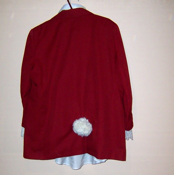 The rabbit costume is based on Tim Burton’s Alice in Wonderland white rabbit but I couldn’t find a blue blazer. I opted to use my old dog show red jacket. I shortened the sleeves temporarily by hand stitching them, then added lace to the cuffs. The lace was cut off a ripped table cloth.
