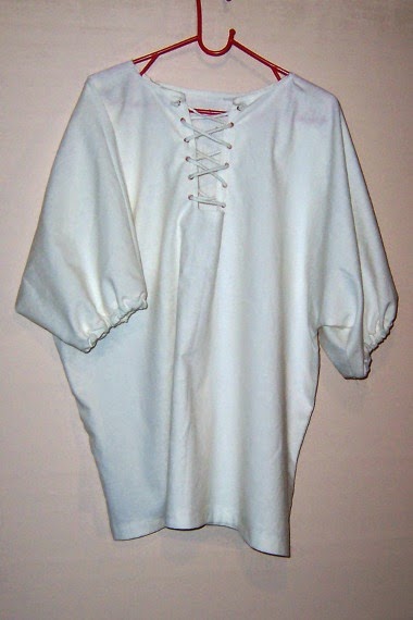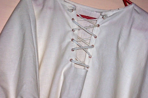 The second plain tunic was better. This one is for the cook and is made of cream fabric with white string. I put more eyelets on this one so it worked better. The sleeves are short cause I didn’t have enough fabric to make the T sides long enough. But its the cooks costume and I figure the cook can have her sleeves pushed up.