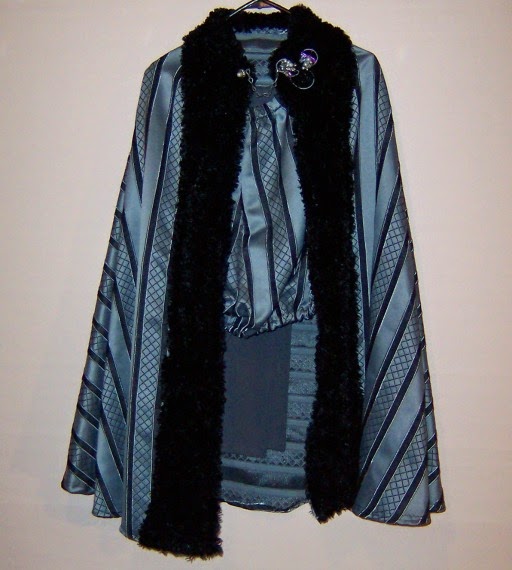 This cape will be worn with a pair of gray leggings (on loan from my wardrobe) and some fake boots (more on those in a later post). I also have a cap for this costume cause when this character is young he won’t need to wear his crown (also in a later post).