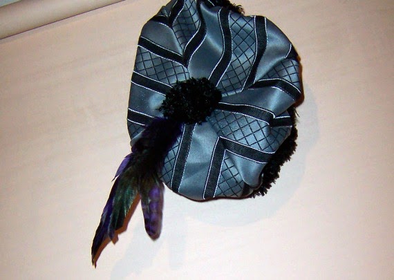 Lastly, the cap was made the same way the cook’s cap was, only this time I had to made it in 4 sections to allow for the stripes in the fabric. I trimmed the edge of the cap with a finer line of scarf/fur, made a scarf/fur pom pom for the top and added a couple of feathers.