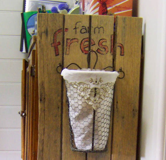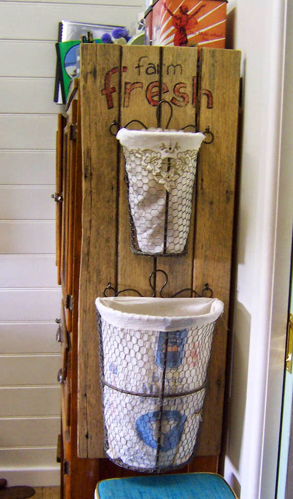 Unfortunately I couldn’t leave the baskets ‘au naturel’ because the bird wire has spikey rough edges. I can just see reaching in for an onion (smaller, top basket) or potato (bigger, lower basket) and ripping your hand to shreds.