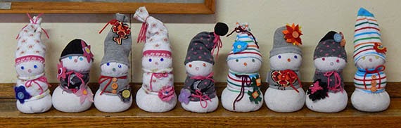 Here they are. So cute all lined up like that. Each lady picked socks and decorations, helped fill the socks with rice and dress the little guys.