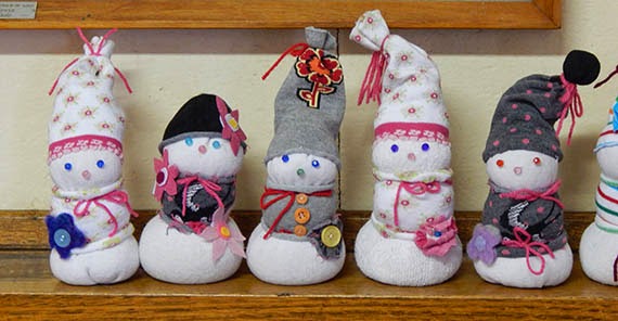 Here they are. So cute all lined up like that. Each lady picked socks and decorations, helped fill the socks with rice and dress the little guys.