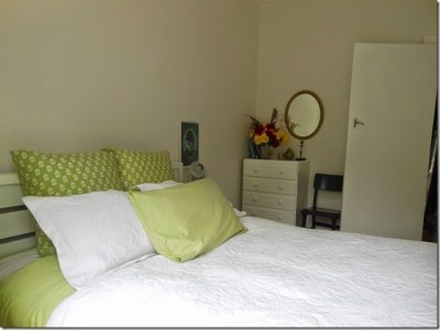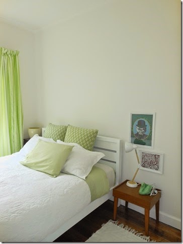 Painting the walls and bed white instantly brightened the place up. Taking inspiration from the green pillow covers she selected a fabric for the curtains which looked good in the shop but turned out a little too lime for her taste. Ain’t that always the way?