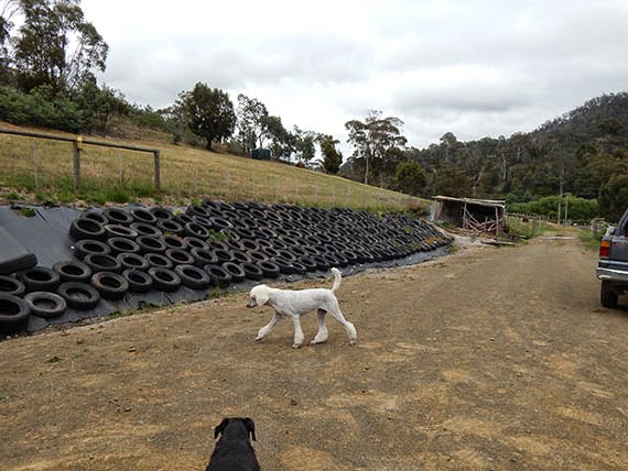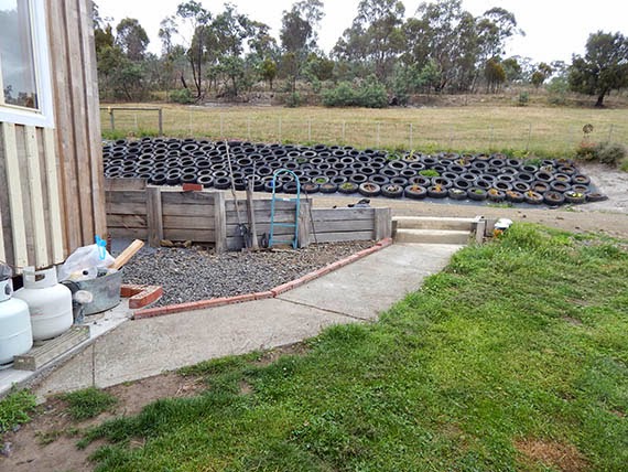 Another view of the tyre wall from the garage to the front gate and our wonky wood shed. We figure about 3 more loads of tyres and we’re onto the next phase: soil and pinebark. I’ve already got some plants in the tyres down the front end, I need a whole lot more to fill the whole wall.