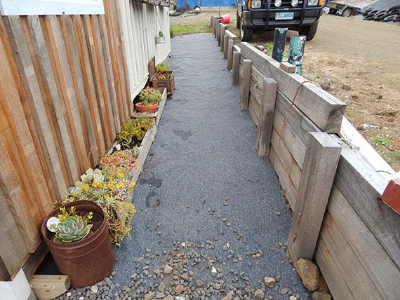 For one thing, he’s put a brick border along the footpath to stop the blue metal (gravel) from falling onto the path and then into the ‘lawn’.