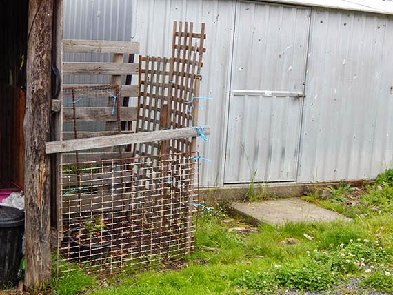 A rickety cage made of a dog pen side, some old trellis, bits of wood and tied together with hay bale twine… add the tyre wall… a bit white trashy huh?