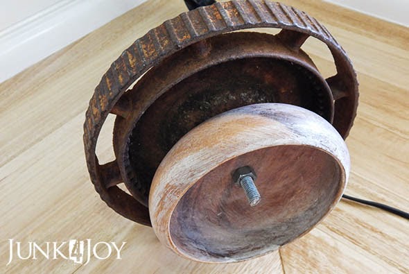 In the end I selected a small wooden bowl from my collection of wooden bowls (cause you never know when you’ll need one). I drilled a hole in it where I guessed the middle was, just wide enough for the screw, then piled the lamp, the wheel thingy and the wooden bowl on top of one another and screwed them together using a couple of nuts.