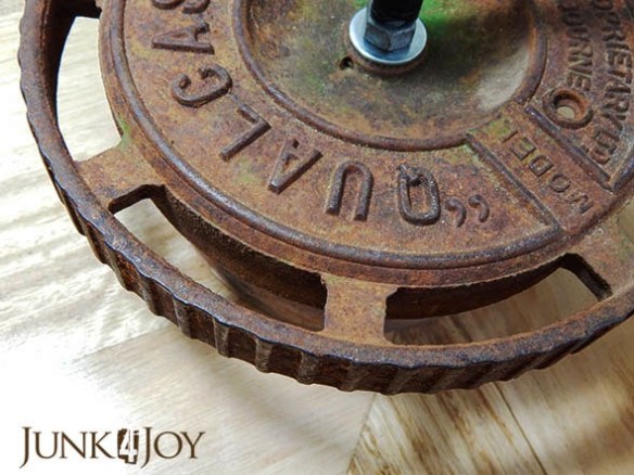 See, I’d run into a problem. I had this round rusty metal wheel thingy I’d picked up at a tip shop ages ago and I knew I wanted to make that the base. However, it had a pokey outey bit on the bottom so it wouldn’t sit flat. And the other side of the wheel thingy was boring so I had to find a way to have the whole thing sit flat with the good side up.