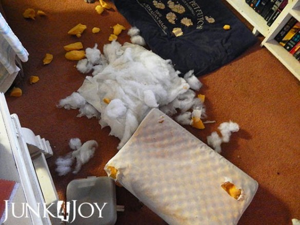 He even decided to just take bites out of the foam on this  pillow. Just picturing him doing this makes me laugh.