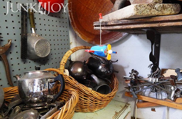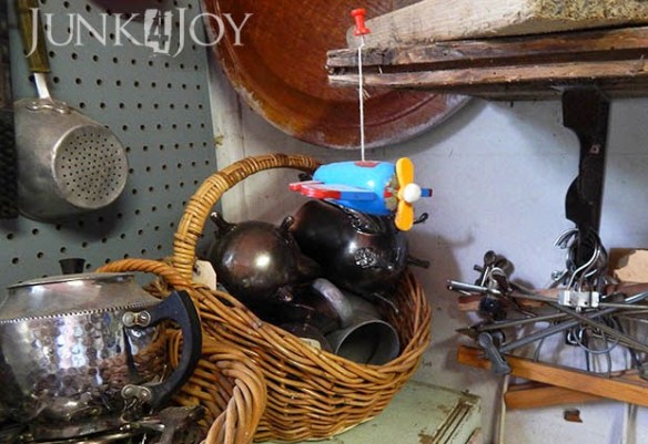 I have lots of collections. I basically collect anything I like the shape of, the colour of, plus anything I think I can use when doing junk art or repurposing. Behind the little airplane you can see a collection of tea pots and creamers and a collection of clothes hangers among other things.