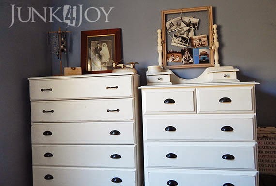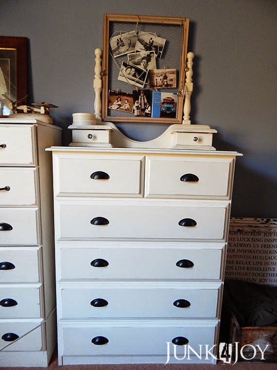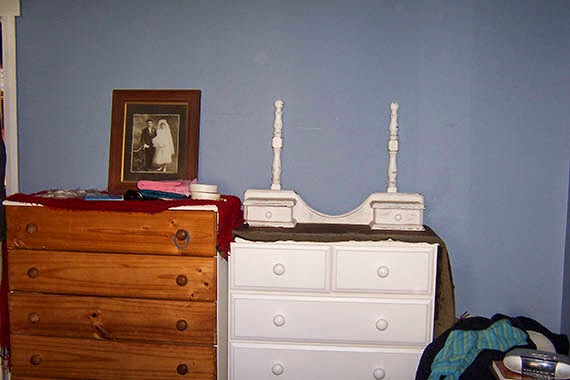 You may remember that when I overhauled the ugly pine chest of drawers a few weeks ago I mentioned wanting to fix up the smaller one to match. Here is an old photo of the two chests side by side in the bedroom as they had been since we moved here.