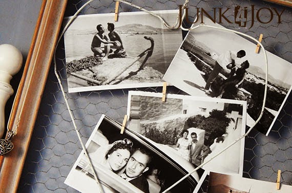 A leftover coat hanger wire heart I made a long time ago for some of my windchimes now frames photos of my mom and dad courting and on their wedding day. I love those photos.