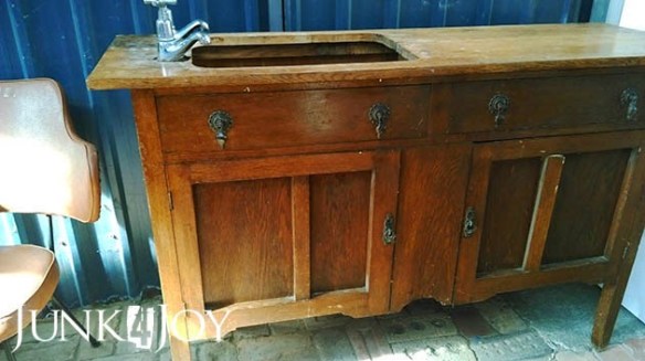 It needed the entire top ripped off and replaced (easy), the door on the right needed major mending, and it all needed a good scrub and de-moulding, then painting… but it would have looked great in our bathroom!