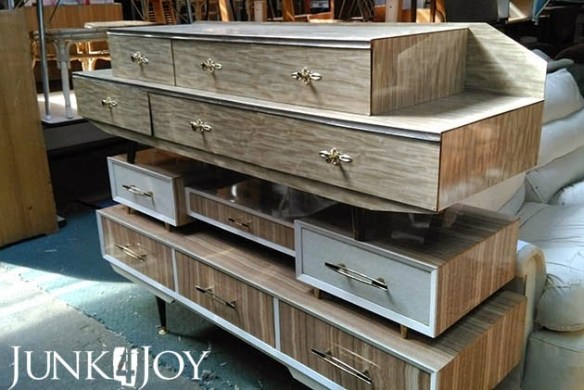 Ok… I don’t want it in my bedroom, but how cool does that look!! I mean, they just stacked them up to save space, but take two 1960s dressers, remove the legs on the top one and join them together, or put on much higher legs to make more space between them, and what a great wall unit!