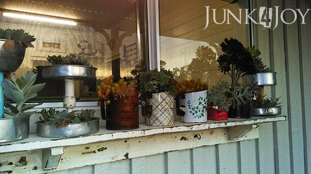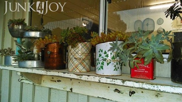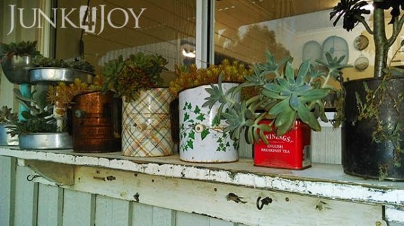 They all have (had) working parts when I got my sticky little fingers on them, so I lined them with hanging basket fibre stuff, then filled them with potting mix before adding a selection of succulents.