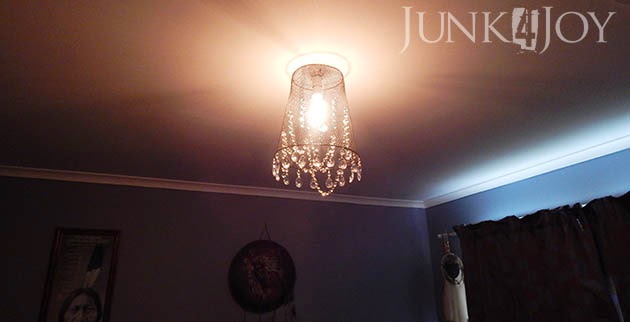 I had some chandelier crystals, I had the bin with a hole in it, just waiting to be reused… I actually found bayonet to E27 screw in globe converters on ebay so I was able to put in an edison bulb.