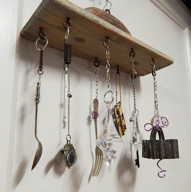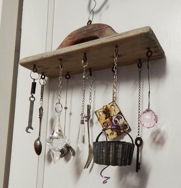 I find these old hand sanders in tip shops occasionally and collect them. I then use my pre-rusted eye screws to hang all kinds of junk from them. I love to add some crystals for a bit of sparkle and copper wire for a bit of colour.
