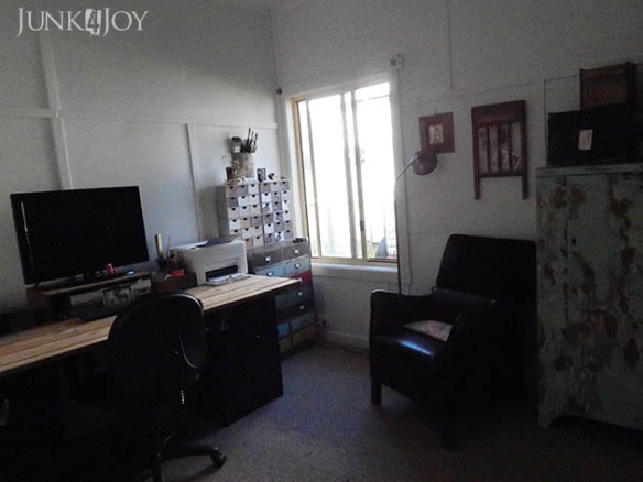 The office used to be the room beyond the bathroom, the room furthest from the living room. When making it over I ripped out the carpet and finished the floorboards, painted the peach blind, painted the walls, put up shelving… I did a lot of work making it a gorgeous room.