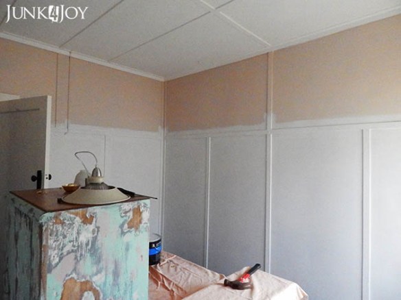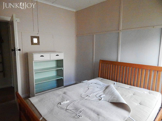 I started painting before I got the bed out cause I needed help to do that. The colour I chose was Dulux Mountain Snow half strength. Its a much cooler white than the one I chose for the kitchen. It might be a bit stark with its undertones of grey, but I really wanted to crisp up the room. The taupe was really getting me down. Here it is after one coat on the bottom part.