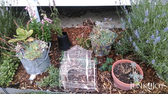 Ditto above, a little further over where a galvanised mop bucket, a rusty bucket, a terracota pot and a birdcage create deterrents.