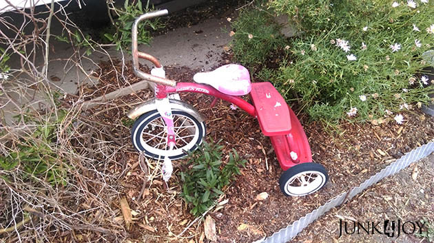 I ran out of pots to use as discouragement so I grabbed my old kid’s tricycle. It doesn’t look too bad there… I think I’ll leave it there and let the plants grow around it.