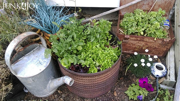 Before Christmas I’d planted some lettuce and spinach in a rusty old washing machine tub and placed it and my basil in a rusty ammo box in part of the garden which the dogs had excavated. I placed a big galvanised watering can and some yellow tractor springs there too. It worked. No more digging and destruction in that spot.