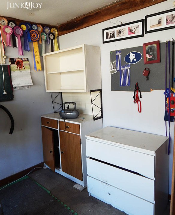 But for my grooming room, I like this better! It reminds me of a gorgeous old kitchen cabinet thing I had in Melbourne. That one was bigger – 3 cupboards and drawers. And it had etched glass in the top bit. I bought it at the Salvation Army and it was original yellowed white paint with the same fake dark timber doors. I painted the doors pale yellow. left the naturally antiqued white, changed the handles and adored it. Unfortunately when I moved to Tasmania there was nowhere to put it in my new house so I gave it to a friend.