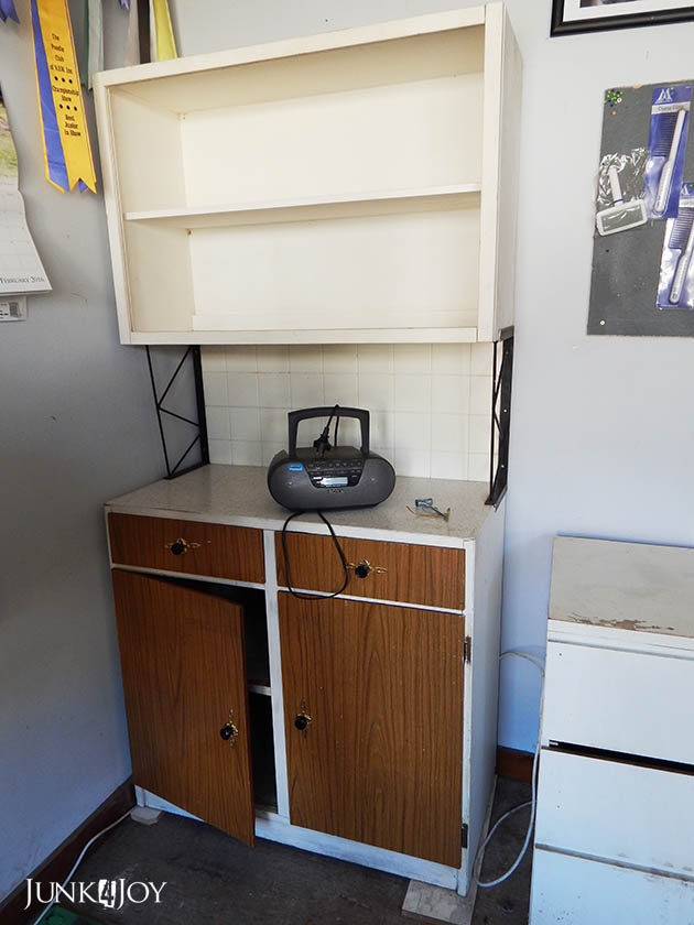 But for my grooming room, I like this better! It reminds me of a gorgeous old kitchen cabinet thing I had in Melbourne. That one was bigger – 3 cupboards and drawers. And it had etched glass in the top bit. I bought it at the Salvation Army and it was original yellowed white paint with the same fake dark timber doors. I painted the doors pale yellow. left the naturally antiqued white, changed the handles and adored it. Unfortunately when I moved to Tasmania there was nowhere to put it in my new house so I gave it to a friend.