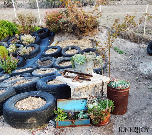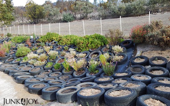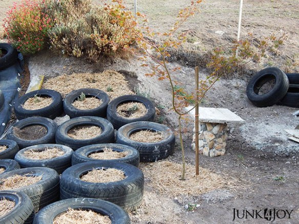 Meanwhile, you may have noticed the tyres around the maple… We’ve now added tyres down lower in front of the new drainage ditch, creating an extended garden area. For now I’ve got some spring bulbs in the tyres closest to the maple but need more plants to fill the other tyres.
