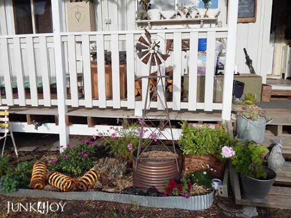 Close to the front door the old washing machine drum which used to hold lettuce now has sweet peas in it. I’m using the broken windmill as a climbing trellis for them when they grow.