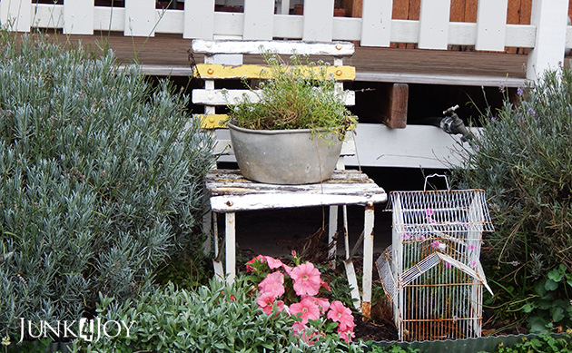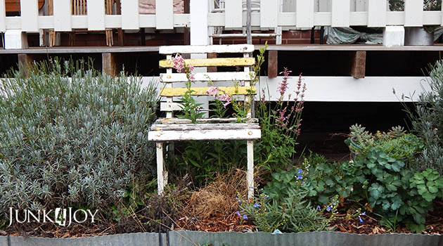There used to be a gorgeous burgundy penstemon growing where the chair (below) is but the dogs dug it up and killed it. I have another one in there now but till it grows up enough to grow through the chair like the one above, I have an old jam saucepan sitting on it.