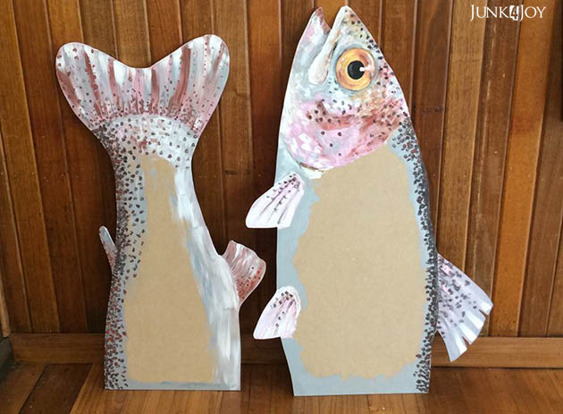Since it was going to be a considerable size and moving it in a car would present a problem, I kept the trout in two parts. I glued strips of wood to the back of both pieces at either end. These served two purposes – the ensured the trout hung out from the wall a bit instead of sitting flat against it, adding dimension. It also gave me somewhere to attach hinges, making this a foldable piece of art!
