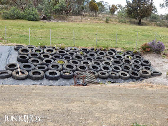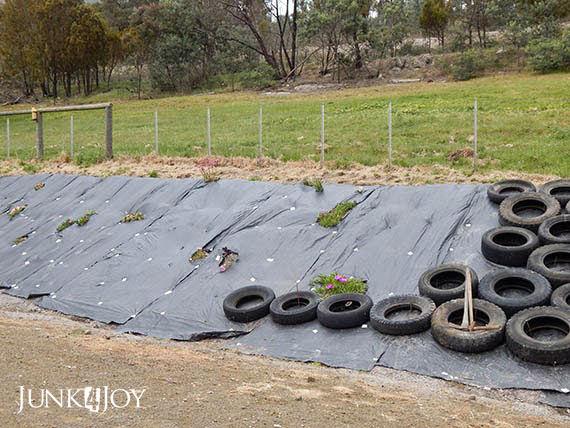 So my next idea: tyres. First we put down weed matting to stop the weeds. Then we put down tyres.