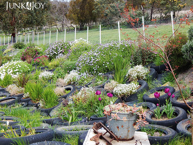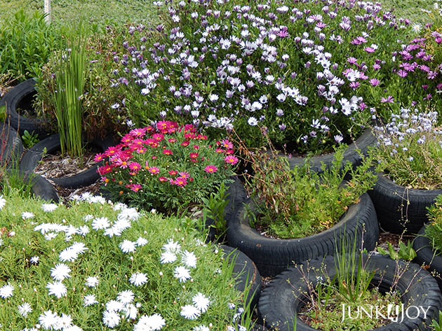 But the soil there is like cement – hard clay. So I figured I could make it work if I used old tyres, filled them with dirt to give the plants something to grow in till they could find their way into the cementlike dirt below. Its been a long, tiring project, but its finally beginning to look like I envisioned.