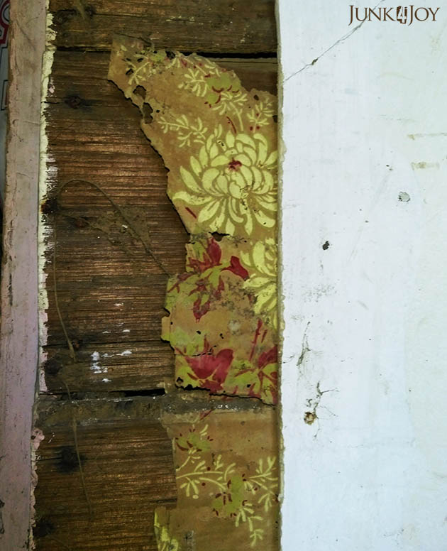 Anyway, when I pulled off the plaster on the wall leading to my workshop, which is lined in timber, I found this gorgeous moth eaten wallpaper. I wish it had been in better condition. I’d have kept it!