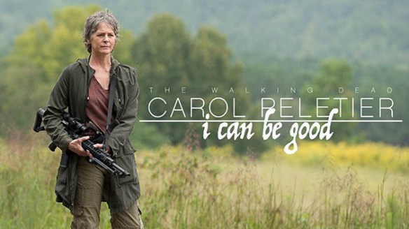 Carol has a trench knife (actually she has two, one is bigger than the other with a silver blade, the other is all black) and a gun. Her belt is made of a tiny strip of leather off an old jacket I bought years ago and never did anything with. The buckle is a rusty washer. The knife sheath is also made from the same leather.