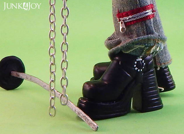 Since I couldn’t give her gloves I gave her a wristband – a Monster High accessory I adapted. Her boots were a wierd tan brown so I painted them black with silver details to look like biker boots.
