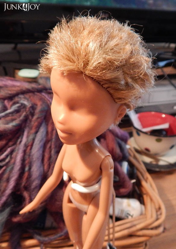 My Carol doll already had cut off hair so after washing her and removing her face, I gave her a better haircut first up. Dolls who aren’t meant to have short hair aren’t rooted evenly all over their heads, so she had bald spots. I used tacky glue and tufts of hair to fill these in.