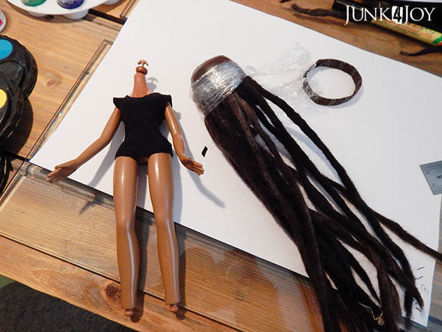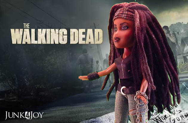 With Michonne I had to remove all the doll’s hair, repaint the face, then give her dredlocks. I did this by wet felting squares of black and different shades of brown wool. I then cut those up and worked them into dreds. I glued those onto the doll’s head one layer at a time, making a head band out of a scrap of fabric.