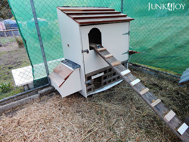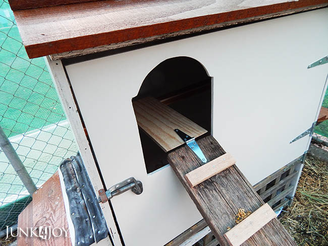 Lastly, I used a long piece of barn wood as a ramp. I used offcuts to make little steps on it to make climbing easier. I added a hook to the back of the ramp to hold it securely to the door, and hinged on a walkway leading to the perch.