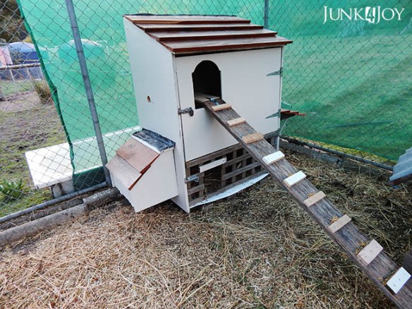 Turned out the ladder I made for the chickens’ new home was too steep. Well, even if it wasn’t, they refused to use the perch. I’d sneak in every night and grab them and put them on it. The hen would stay but the rooster would just jump off and sleep in the corner on the bottom of the box.
