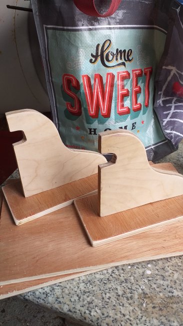 I mounted the brackets onto flat bits of ply so I can attach them easily to the wall, and voila. A couple of coats of paint and they’re ready to put on the wall.
