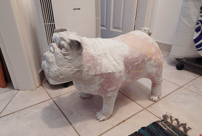 He’s pretty much done now. All the basics are done and he only needs fine tuning. That doesn’t mean there won’t be more carving and adding, it just means the main shape is now done. I worked with plaster and strips of fabric today, the odd bit of toilet paper soaked in the mixture to fill gaps.
