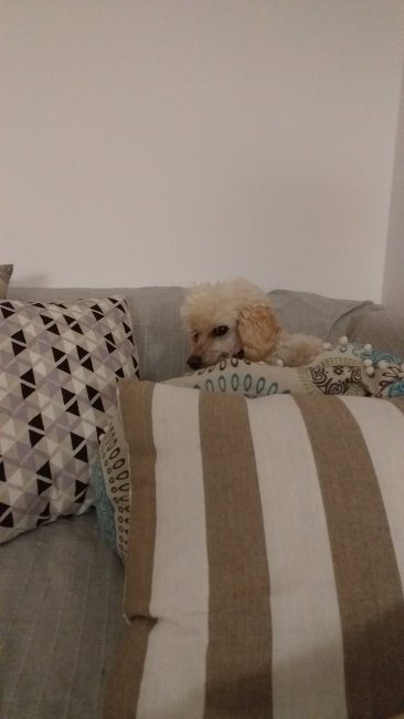 Still cold and windy on Paros. We really don’t like going out when its like this. Lainee has found a little hiding place in the corner of the couch where she sits and watches me work during the day. Sometimes she sinks so far in there I can’t even see her.