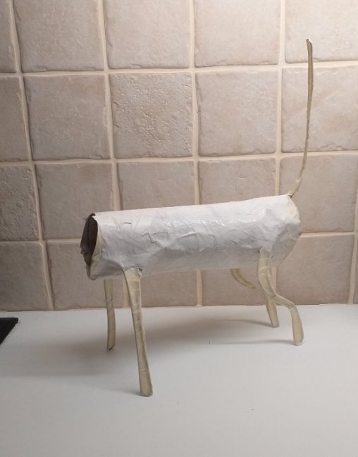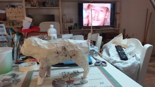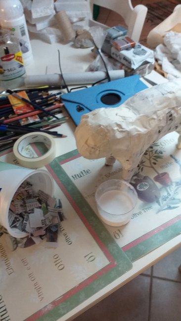 I’d been slowly building up the cat body using scrunched up paper, aluminium foil and masking tape, then layes of papier mache. Today I added the head and continued layering paper to give it strength. With papier mache I found that I build up as I need to, even trimming bits off when necessary as I did with the bulldog. I will most likely begin working with papier mache pulp for the next steps.