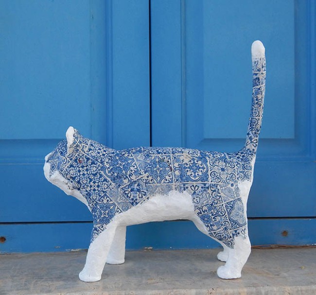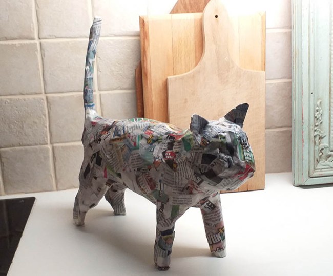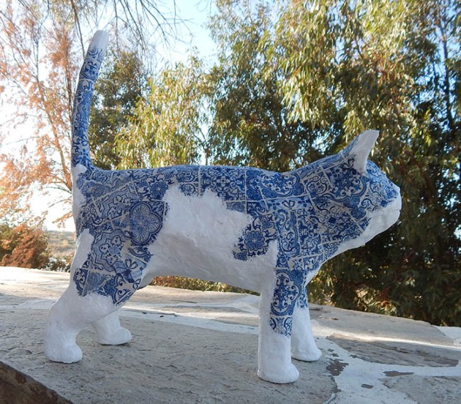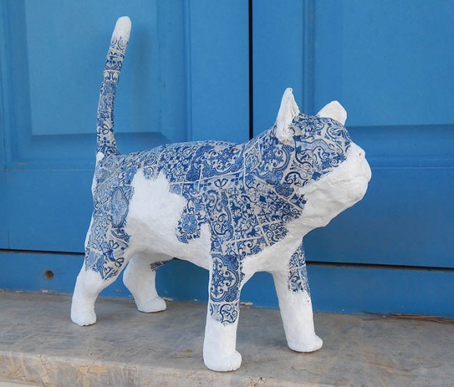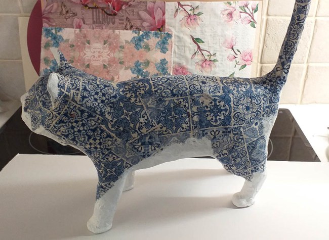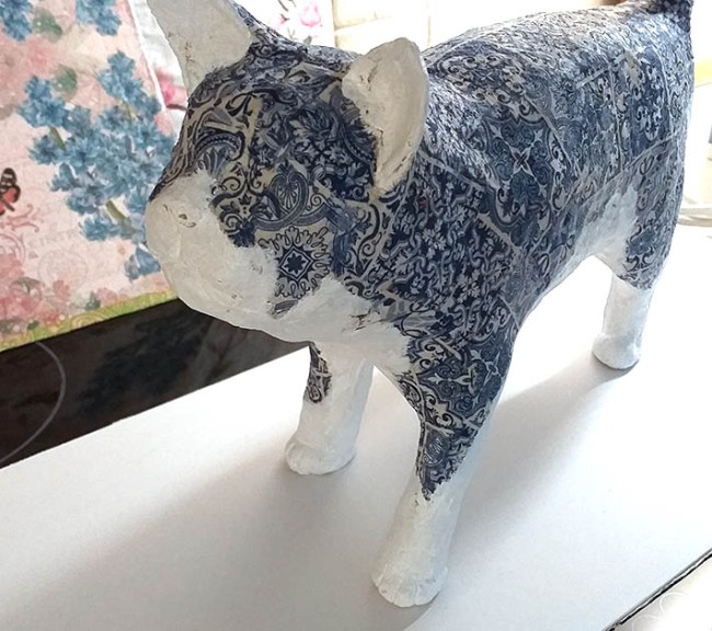 Anyway, the process was similar to the bulldog – starting with cardboard shaped and held together with masking tape. Then papier mache newsprint over the top. I then added a layer of papier mache pulp to smooth her out and create her face and paws. Lastly I decoupaged parts of her in a blue and while napkin and painted the rest to make it really white as the pulp is a pale grey naturally.