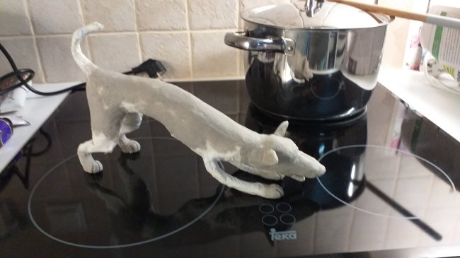 Well here goes: I cooked up some chicken and vegetables for Lainee, oh, and I progressed on my playing dog sculpture. (This is what happens when your studio is also your kitchen.)