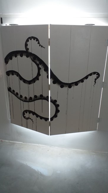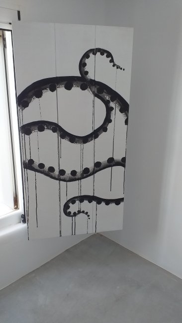 I’m not sure my cousin feels the same way. It might be too ‘arty’ for him, but that’s ok, I’m happy to redo if so.After all, he’s the one paying (in coffee…). I’ve been wanting to do octopus tentacles on his living room wall or on the ‘aloni’ (a cemented threshing circle in the yard) for years, at least I got a chance to do them SOMEWHERE in his house!